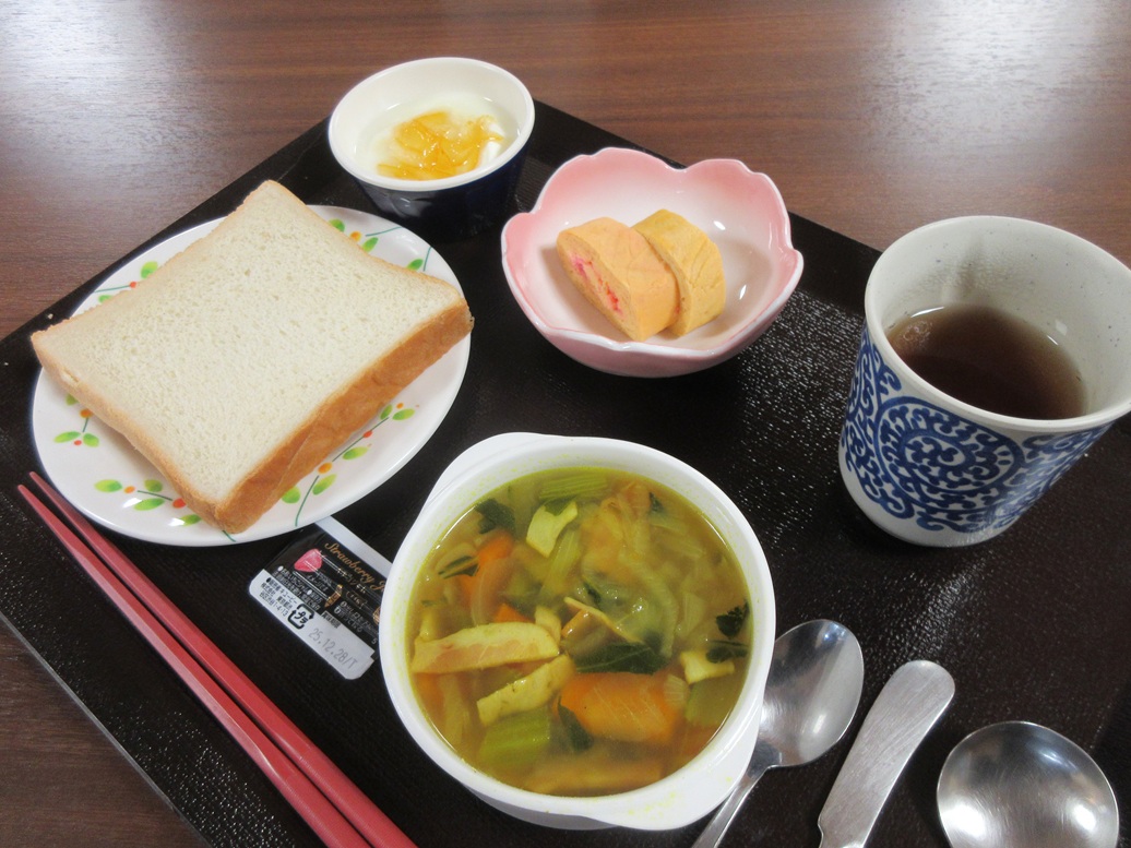 他にも主食の食パンとでんぶ入りだし巻き卵、小松菜と