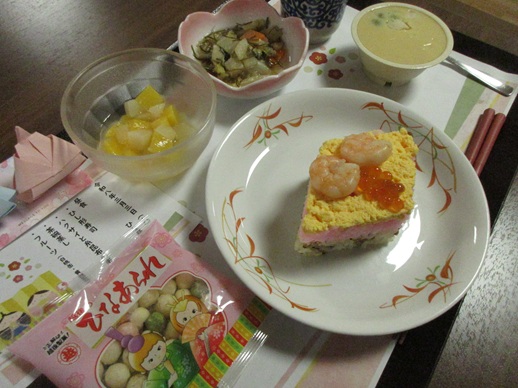 ひな祭り 彩り豊かな菱形寿司と手作りお雛様