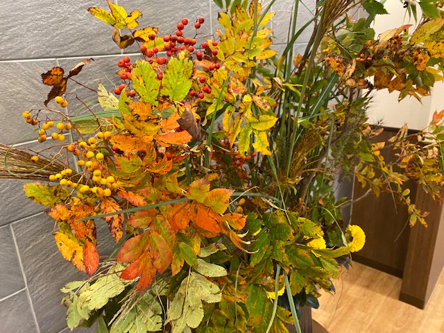一つの花器で様々な秋の彩を感じられるアレンジですね。