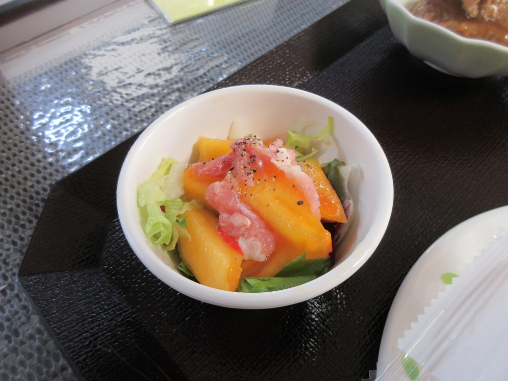 色鮮やかなベビーリーフの上に、甘い旬の柿と、塩味の効いた