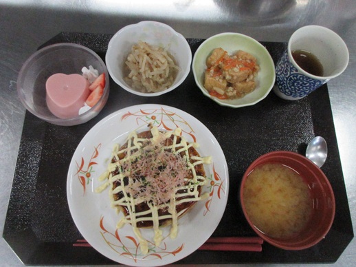 本日の昼食は、お好み焼きといちごミルク